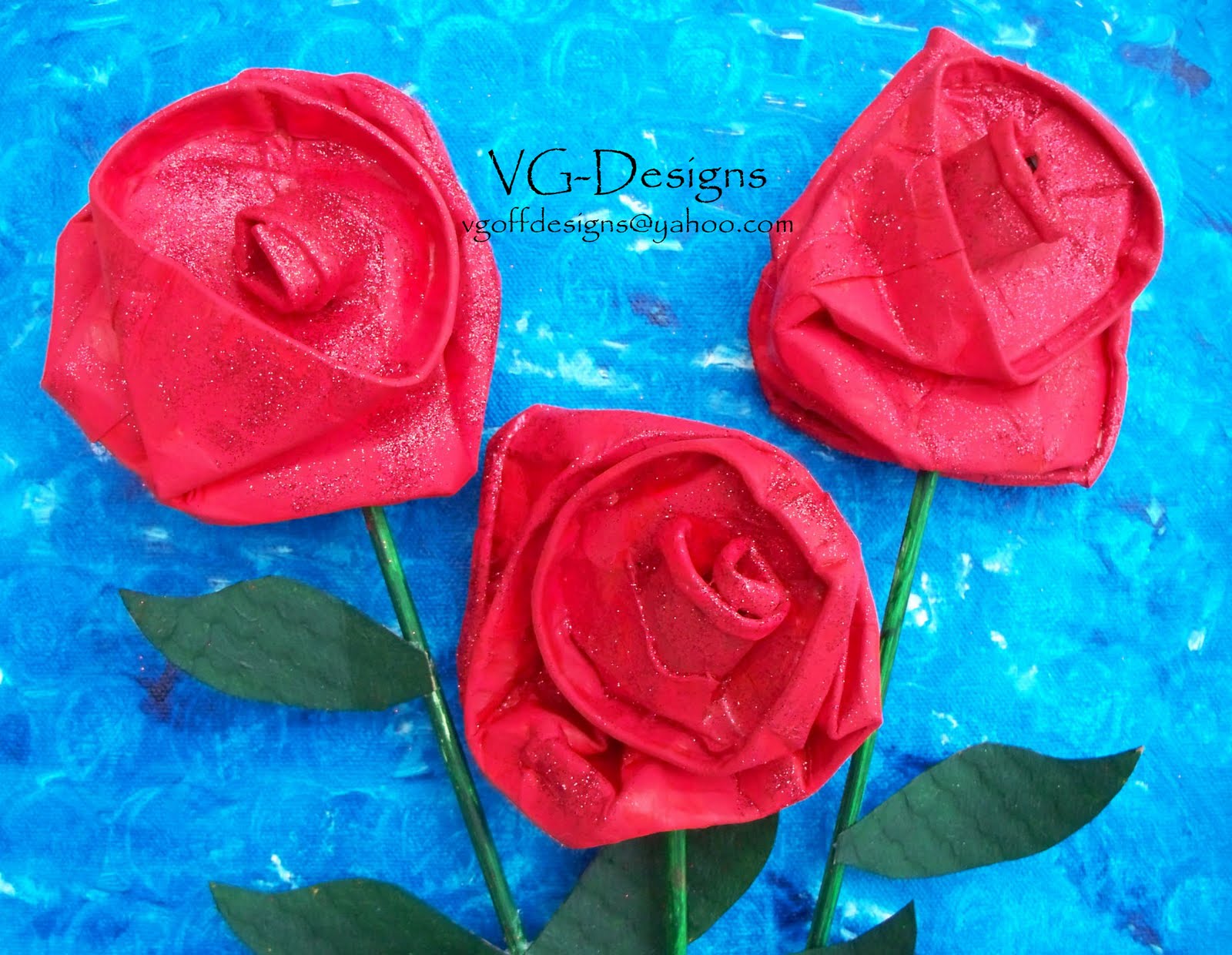 The coffee cups came from Starbucks, minus the coffee as we drank every drop before turning it into a work of art. Painted with red acrylic paint & then added a touch of red glitter for a touch of sparkle that the picture doesn't show well. The stems are simply skewers painted green. The leaves were drawn on the coffee cup sleeves, cut out & painted green. Beacon's Quick Grip was used where ever needed for a strong hold that can't be beat anywhere, believe me I KNOW!